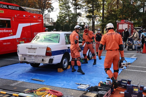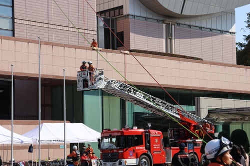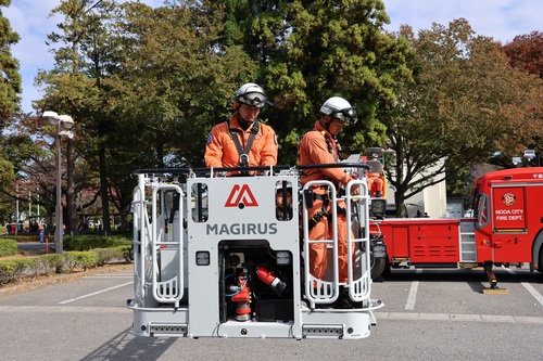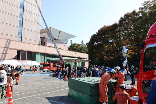 当日は、消防車両のパレードをはじめ、新型はしご車を使用した救出救助訓練やはしご車搭乗体験、ロープ渡り体験、消防音楽隊による演奏披露など数多くのブースが用意され、会場内はたくさんの人で賑わいました。