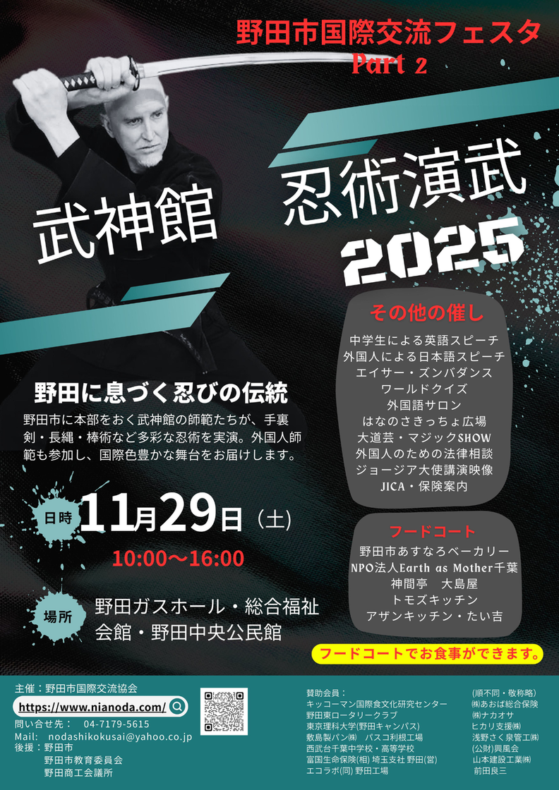 当日は、お忙しい中、千葉県の熊谷知事にもご来場いただき、野田市に本部道場を構え、世界約50カ国に道場を持つ「武神館」の皆さんによる迫力ある忍術演武をご覧いただきました。