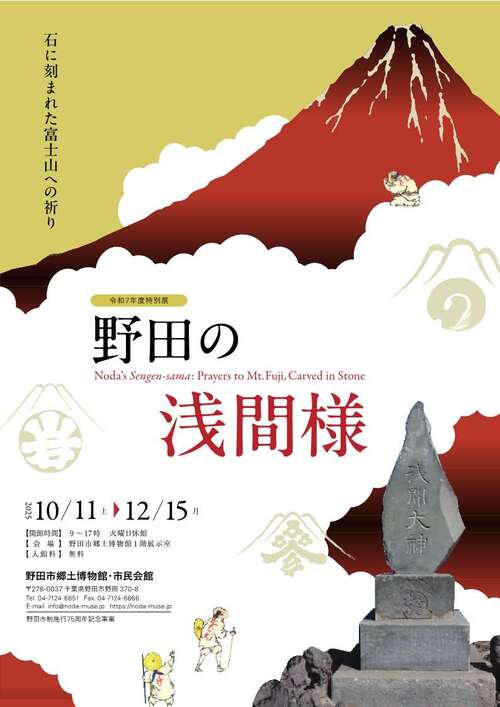 日本一の高さを誇る富士山は、古来より、信仰の対象となってきました。特に、江戸時代後期にかけて、富士山を信仰する人たちの仲間である富士講が数多く成立していきます。野田市域では、明治時代を中心に、富士山の信仰に関わる石造物が数多く建立されており、これらは現在でも見ることができます。