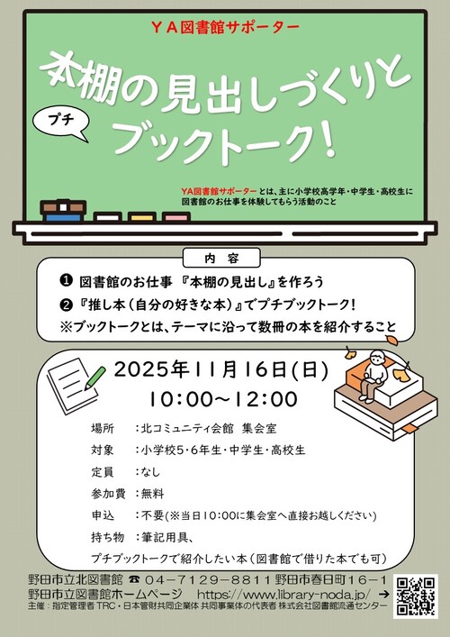 YA図書館サポーターとは、主に小学校高学年から高校生に図書館の仕事を体験してもらう活動のことです。