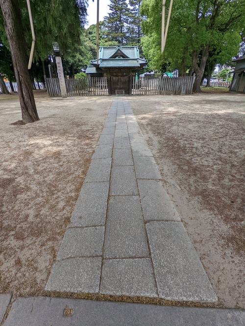 答えは、上花輪の香取神社です。室町時代の天文年間(1532年から1555年)に創建されたと伝えられます。道の敷石は公益財団法人梨本家上花輪歴史館の副館長の梨節子さんによると、先代の梨兵左衛門さんが都電(東京都電)廃止の際に、払い下げられたものを購入し、この地に敷設したそうです。都電は、東京都内の道路を走る路面電車で、都民の足として活躍し愛されましたが、戦後の自動車増加による交通渋滞が深刻になり定時運行が困難になってきたことで次々に廃線となり、昭和47(1972)年には専用軌道が多かった1路線(早稲田駅から三ノ輪駅)を除いて撤去され、大量の軌道敷石やレール、車体の払い下げが各方面へ行われたそうです。都電の敷石は上等な御影石であったため、都内各地でも再利用され、銀座の石畳の歩道の一部も都電の軌道敷石を削り直して現在も使用されていると言われています。上花輪香取神社の参道は、懐かしい都電の面影を野田で味わうことができる場所です。