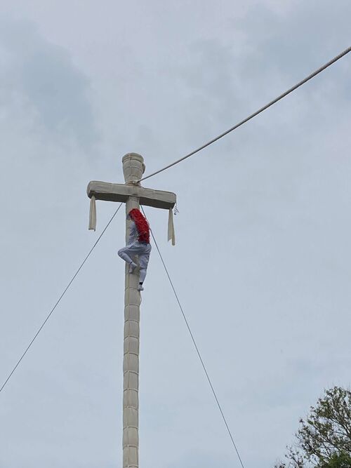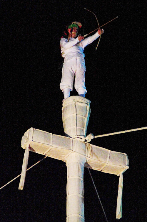 津久舞の記録はほとんど残っていませんが、昭和8年にまとめられた「愛宕神社年暦」では、享和2(1802)年に大変な干ばつがあり、雨乞い祈願のため重次郎さんが登ったのが初めてと記録されています。ところが、大正時代にジュウジロウさん(舞手が変わっても同じ呼び名)の落下事故のため、人形でやらざるを得なくなるなど、約15メートルの津久柱での軽業芸は危険と隣り合わせで、たびたび中断を余儀なくされ、記録では昭和8(1933)年に復活しましたが昭和14年以降は戦争をはさんで中止され、戦後約10年間はお囃子だけの時期がありました。