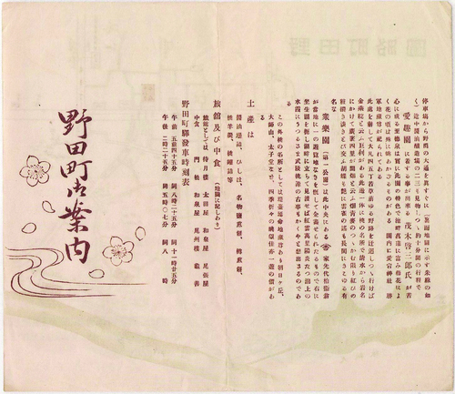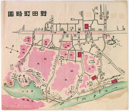 明治27(1894)年に開園した清水公園は、野田で醤油醸造業を営む柏屋5代目の茂木七郎右衛門(柏衛)によって設立されました。開園当初は「聚楽園(現在の清水公園第1公園付近)」と呼ばれ、春になると桃の花が一面に広がる風光明媚な場所でした。渋沢栄一や大町桂月などの文人墨客も訪れ、さまざまな紀行文や短歌、詩歌などが残されています。同園は、当時の観光案内(明治44年以降)にも桃の名所と紹介されています。桃の栽培は、岩名を中心に、江戸時代の中頃より昭和の初期頃まで行われ、醤油やせんべいと並ぶ野田の名産品でしたが、市場に甘い海外種の桃が出回ると、在来種の野田の桃は次第に衰退していきました。
