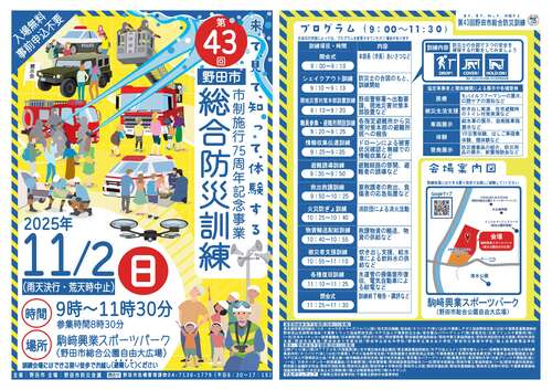 [画像]第43回野田市総合防災訓練_1(71.9 KB)今年の総合防災訓練は、『来て、見て、知って、体験する』をコンセプトに、多くの市民が参加・体験できるものとし、市民一人ひとりが「自らの命は自らが守る」という意識を持ち、「公助」も含めた市全体の防災力の向上を目的として実施します。