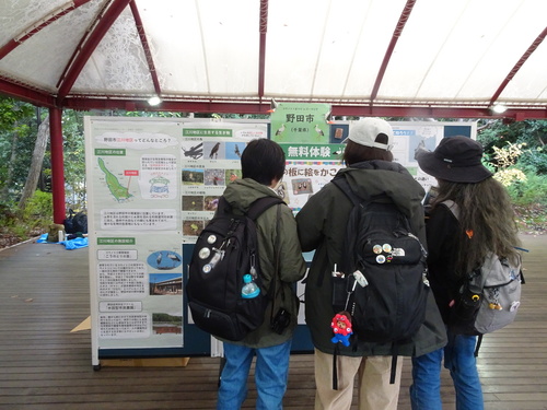 [画像]ブースの様子(72.3 KB)野田市は、今年度のインターンの学生さんが作成した「コウノトリの生態紹介」と、飼育施設“こうのとりの里”がある「江川地区の紹介」のパネルを展示しました。