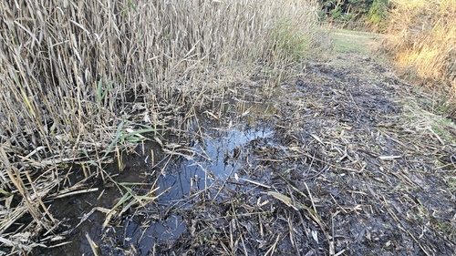 産卵場所に適している池は、作業前はヨシが生い茂り、水面がほとんど見えない状態でした。