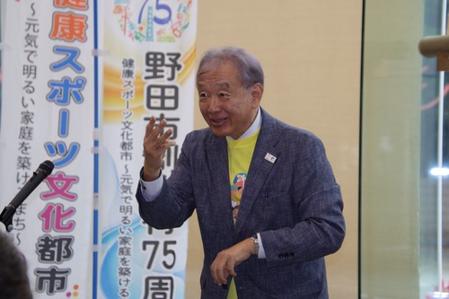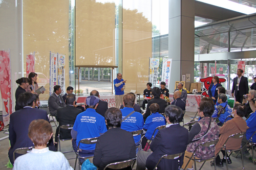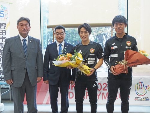 代表選出報告のため8月25日、瀧澤選手は市長を表敬訪問。瀧澤選手は「けがをしてしまいましたが、リハビリ中は自分との戦いと思い、熱い気持ちを持ち続けました。無事に日本代表へ選ばれて、うれしいです。自分はドリブルから、ゴールに向かう攻撃的なプレーが得意。耳の不自由な子どもたちに夢を与えられるような存在になれれば」と話し、市長は「けがを心配していましたが、代表選手に選ばれ、本当に素晴らしい。大会での活躍を期待しています」とエールを送りました。