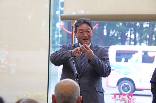手話を交えた市長や議長のあいさつのあと、ピンク色のキャラバンカーをバックに横断幕を掲げ記念撮影を楽しみました。