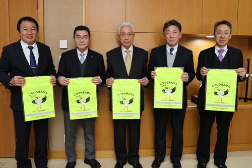 新入学児童の交通安全のため、一般社団法人野田交通安全協会様及び野田地区安全運転管理者協議会様、千葉県トラック協会野田支部様よりランドセルカバー1,090枚が寄贈され、令和8年1月29日(木曜日)に寄贈式を行いました。