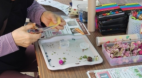 森の中で拾った葉っぱや木の実などを材料にしました。