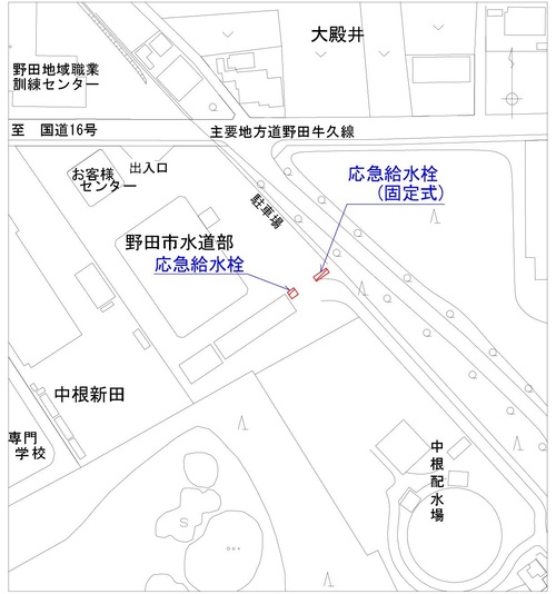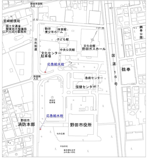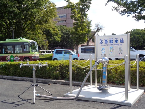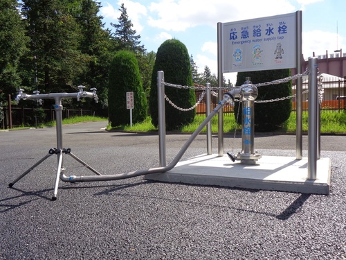 水道部では大規模な地震などの災害時用に野田市文化センター駐車場・市役所正面玄関入口付近・水道部の中根配水場内に応急給水栓を整備しました。